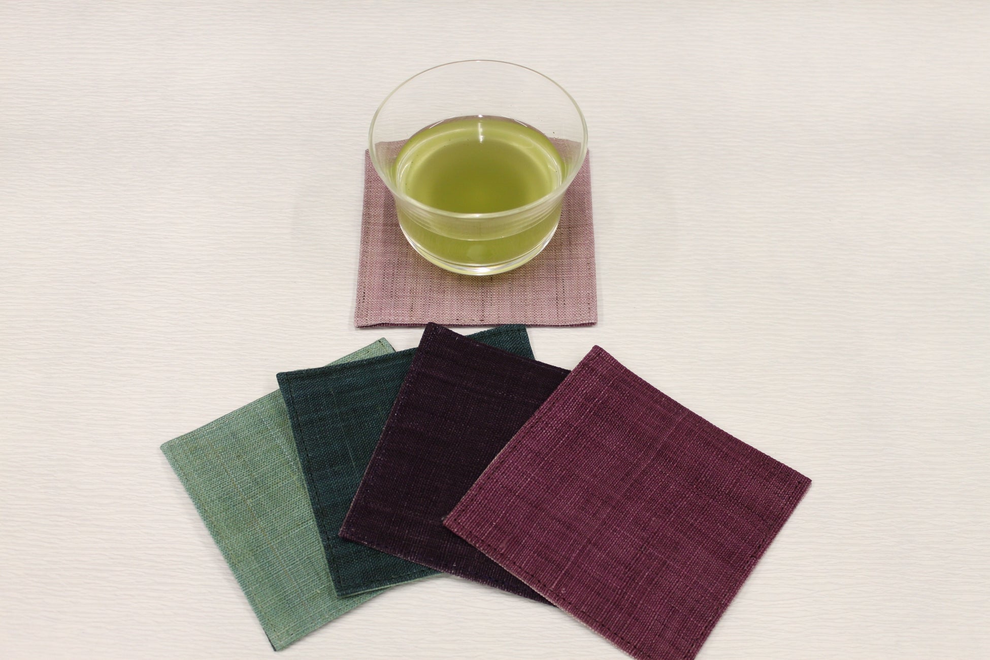 染司よしおか六代目吉岡更紗さんが、自然の植物から汲み出した色で染めたコースター5枚セット【青紅葉のかさね】と【杜若のかさね】です。源氏物語など古典から感じ取った色をはんなりと表現しています。ブックカバーもあります。