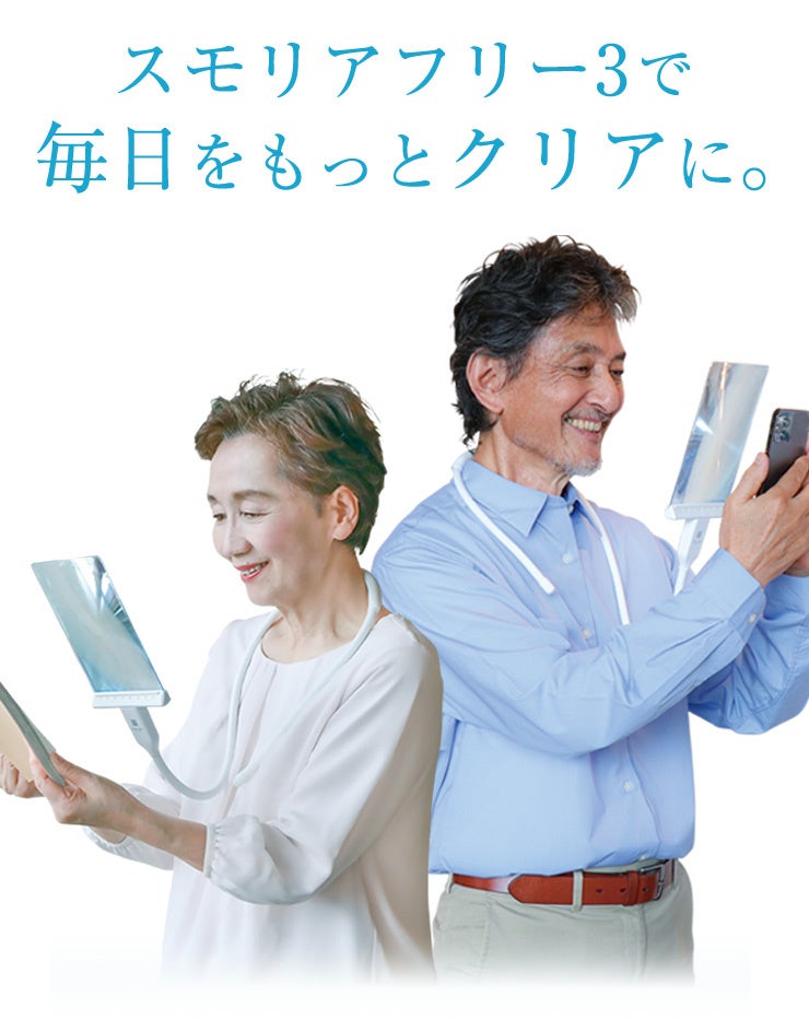 スモリアフリー3は、首にかけることで両手を自由に使える新型の拡大鏡です。この製品は、約1.8倍の拡大率を持つ、ゆがみの少ないレンズが特徴です。 球面レンズを使用しないため、歪みなく対象物をくっきりと拡大し、細かい文字もはっきりと読むことができます。老眼鏡と併用できるため、老眼鏡による日常的な遠近距離の視界と、それよりも更に近い距離や手元の小さい物を見るための視界をハンズフリーで簡単に得ることができます。そして、LEDライトが搭載されているため、暗い場所でも明るく見ることが可能です。また、フレームレスのデザインで、視界の妨げを最小限に抑え、軽量設計で長時間の使用でも快適です。