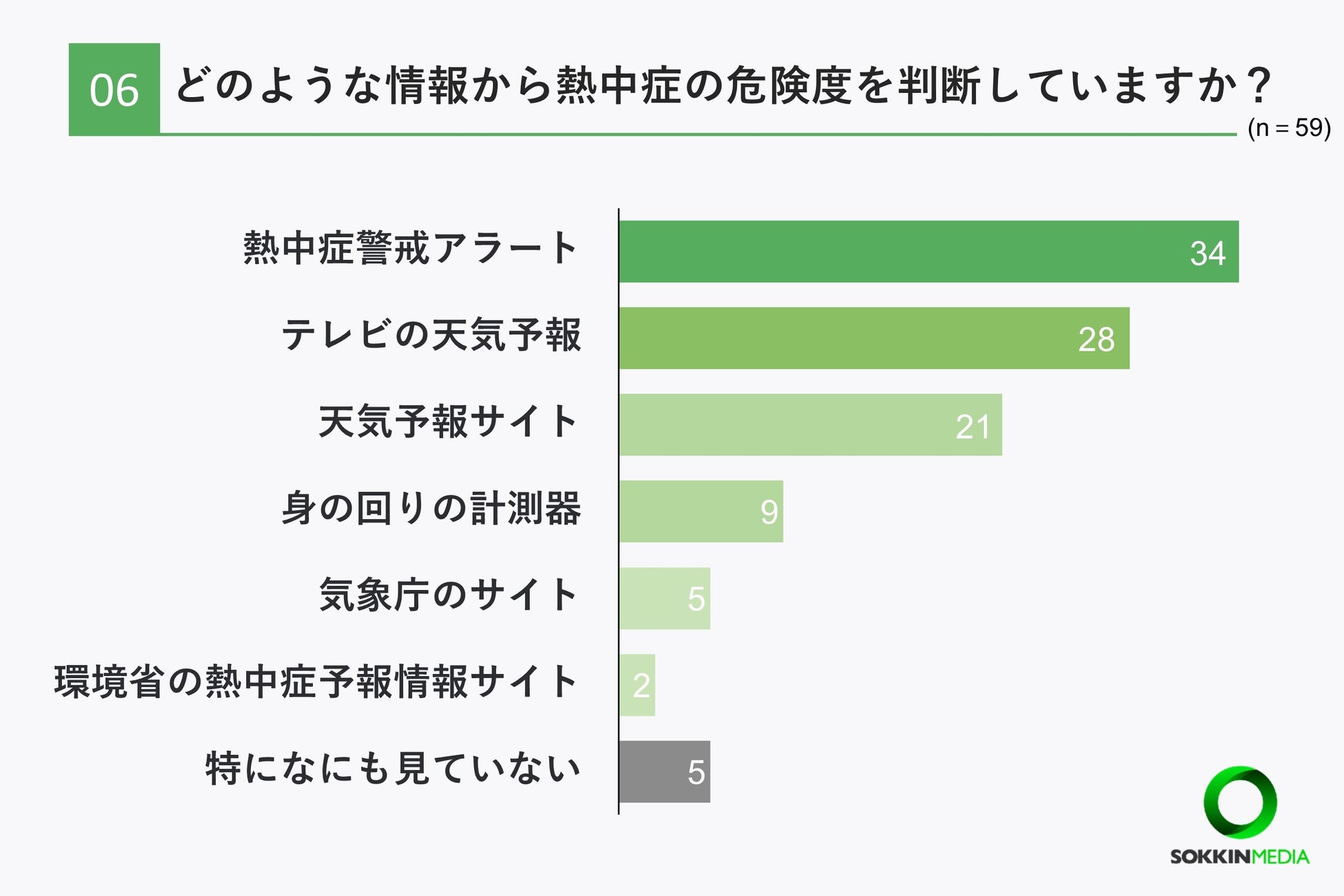 「Q6. どのような情報から熱中症の危険度を判断していますか?」という問いに対して、「熱中症警戒アラート」が最多の34票、次いで「テレビの天気予報」という回答が28票という結果になりました。
