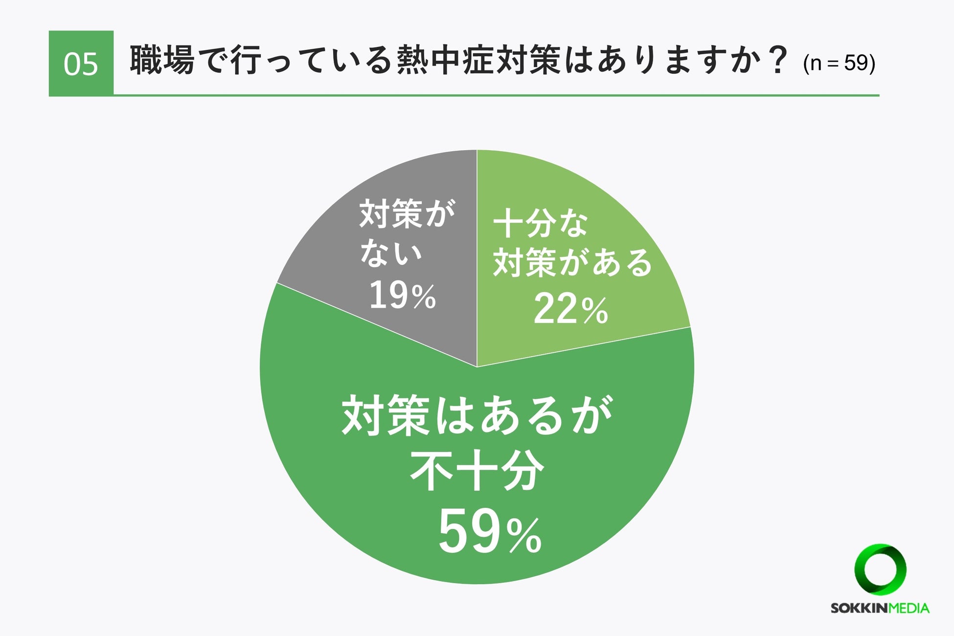 「Q5. 職場で行っている熱中症対策はありますか?」という問いに対して「対策はあるが不十分」と回答した方が最も多く59%に上りました。次いで「十分な対策はある」が22%、「対策がない」が19%という結果になりました。