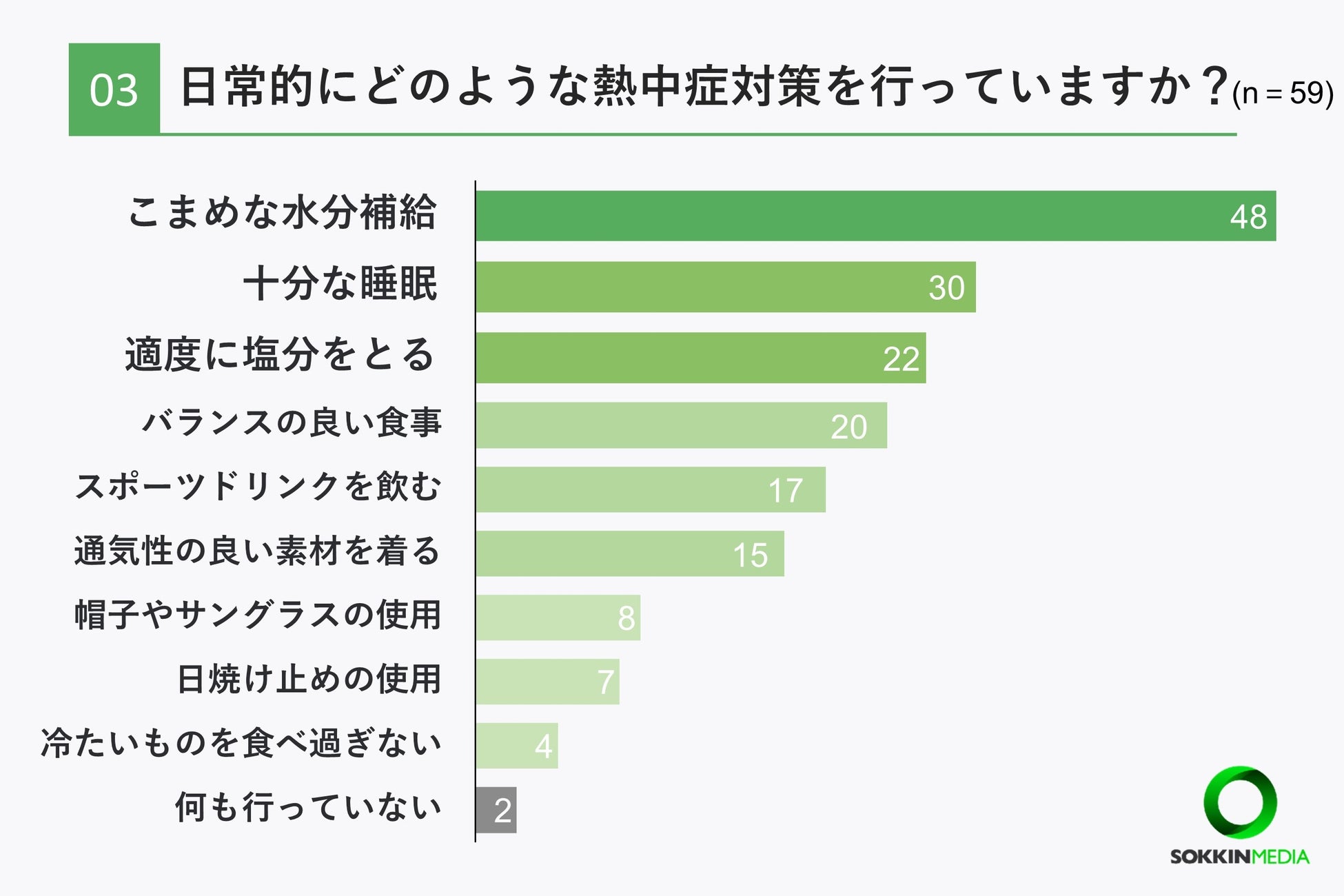 「Q3. 日常的にどのような熱中症対策を行っていますか? 」という問いに対して「こまめな水分補給」という回答が48票と回答者の8割以上に上りました。次いで「十分な睡眠」が30票、「適度に塩分をとる」という回答が22票という結果になりました。