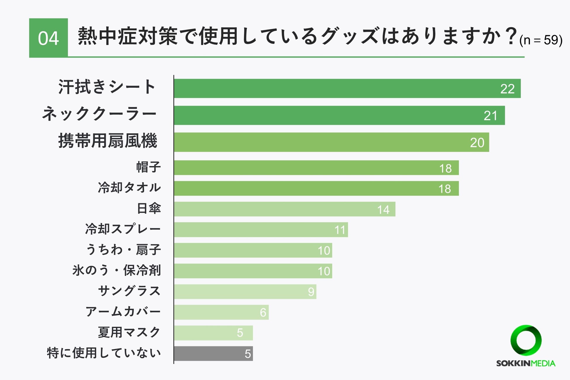 「Q4. 熱中症対策で使用しているグッズはありますか?」という問いに対して、「汗拭きシート」という回答が22票で最多という結果になりました。次いで「ネッククーラー」が21票、「携帯用扇風機」が20票でした。