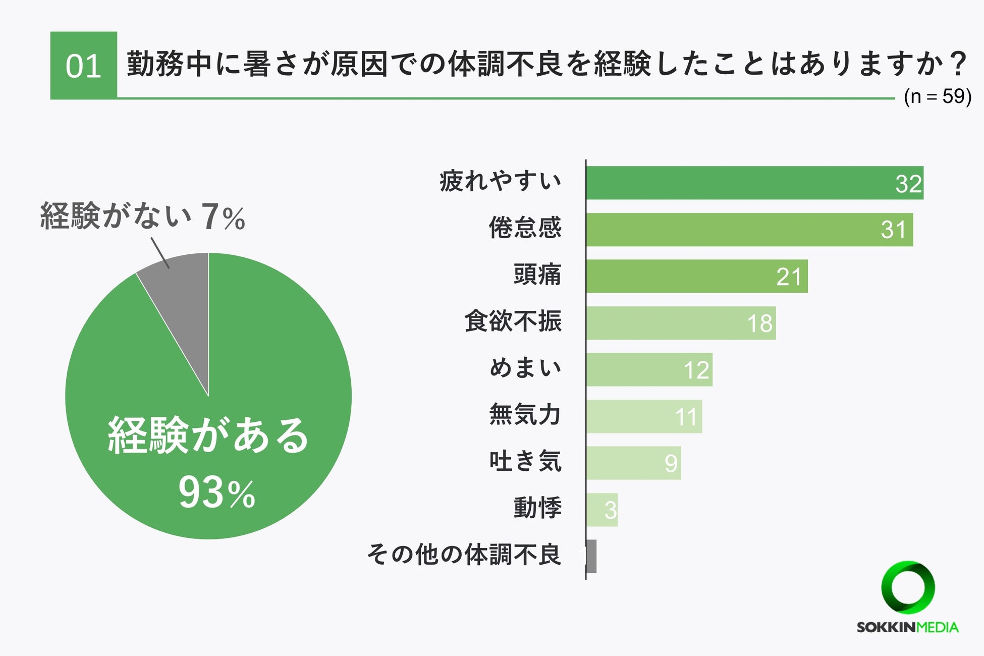 「Q1. 勤務中に暑さが原因での体調不良を経験したことはありますか? 」という問いに対して、「経験がある」方が93%に上りました。また体調不良の具体的な症状として、「疲れやすい」が最も多く32票、次いで「疲れやすい」が31票という結果になりました。