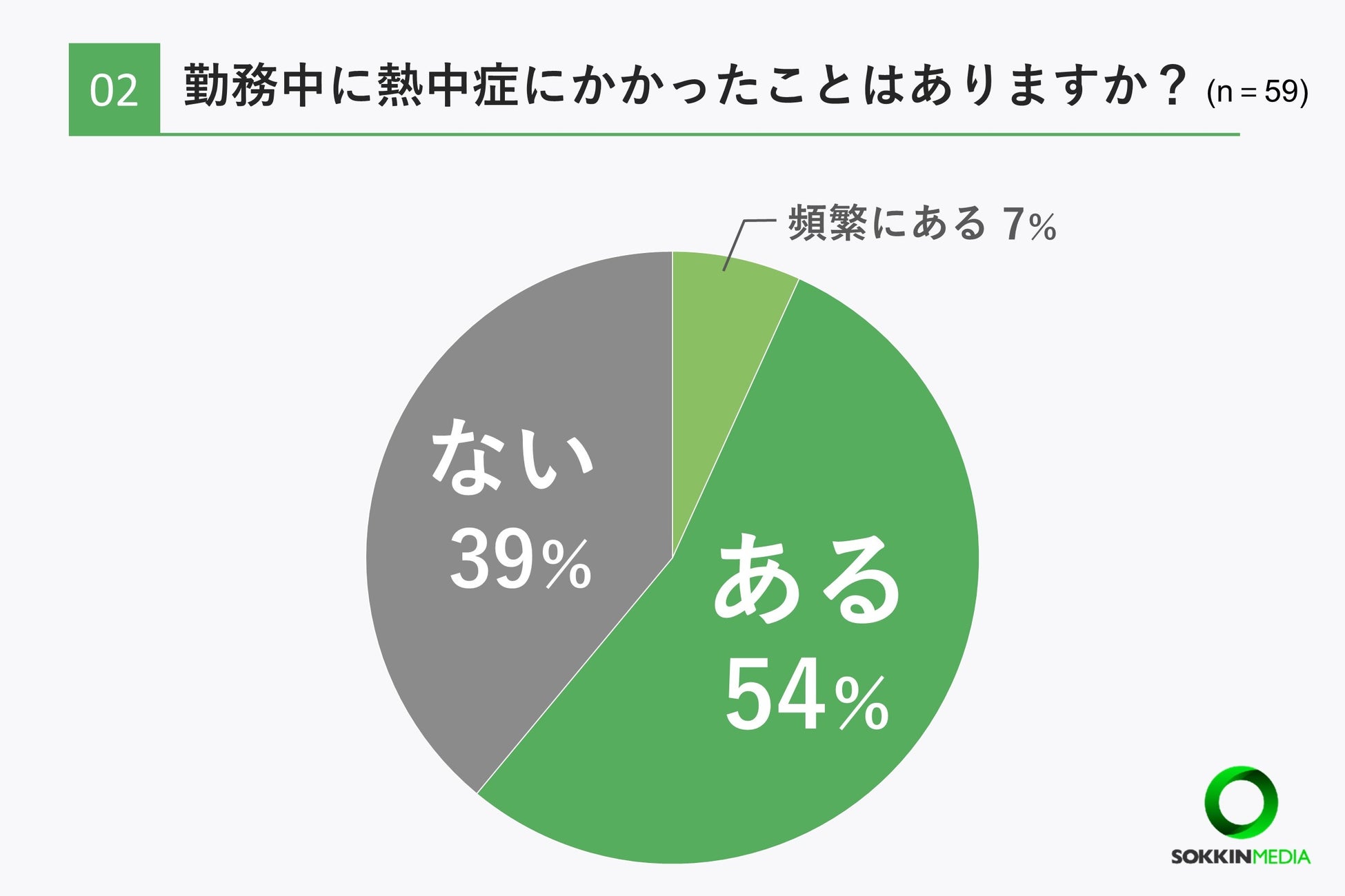 「Q2. 勤務中に熱中症にかかったことはありますか? 」という問いに対して「ある」という回答が61%に上り、中でも7%の方が「頻繁にある」と回答しました。