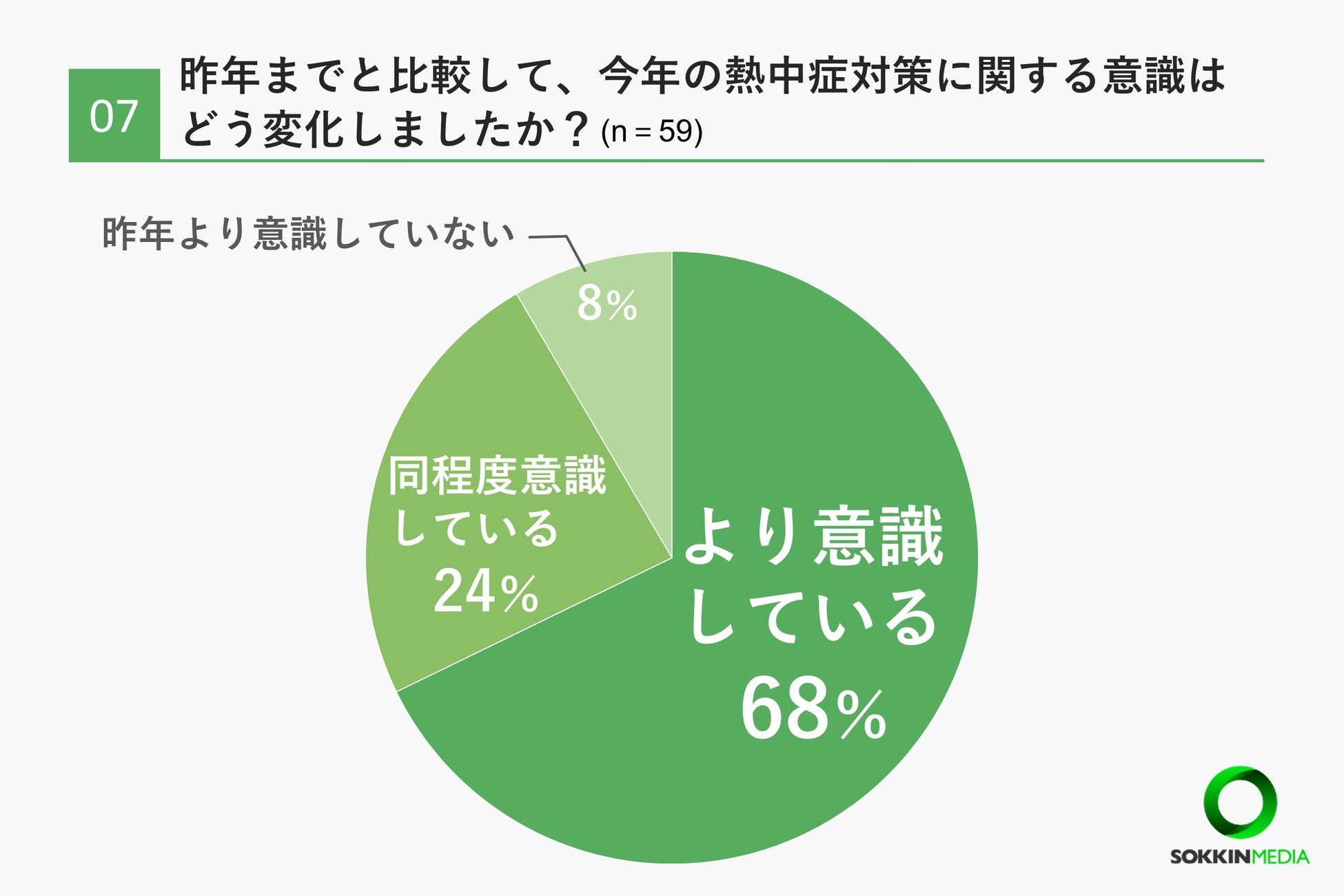 「Q7. 昨年までと比較して、今年の熱中症対策に関する意識はどう変化しましたか?」という問いに対して、「昨年より意識している」という回答が68%で最多という結果になりました。次いで「昨年と同程度意識している」という回答が24%でした。