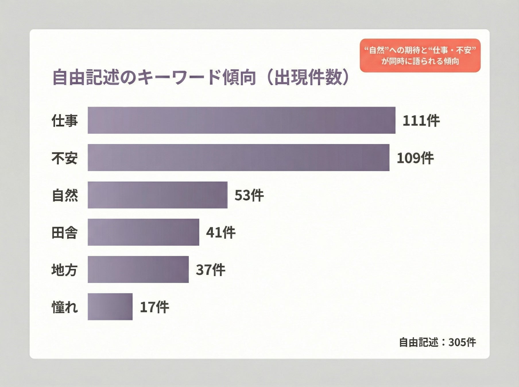 自然豊かな暮らしへの期待と仕事・収入や生活の不安が同時に書かれる回答が多く、移住が理想だけでなく生活設計の再構築として捉えられている様子がうかがえます。