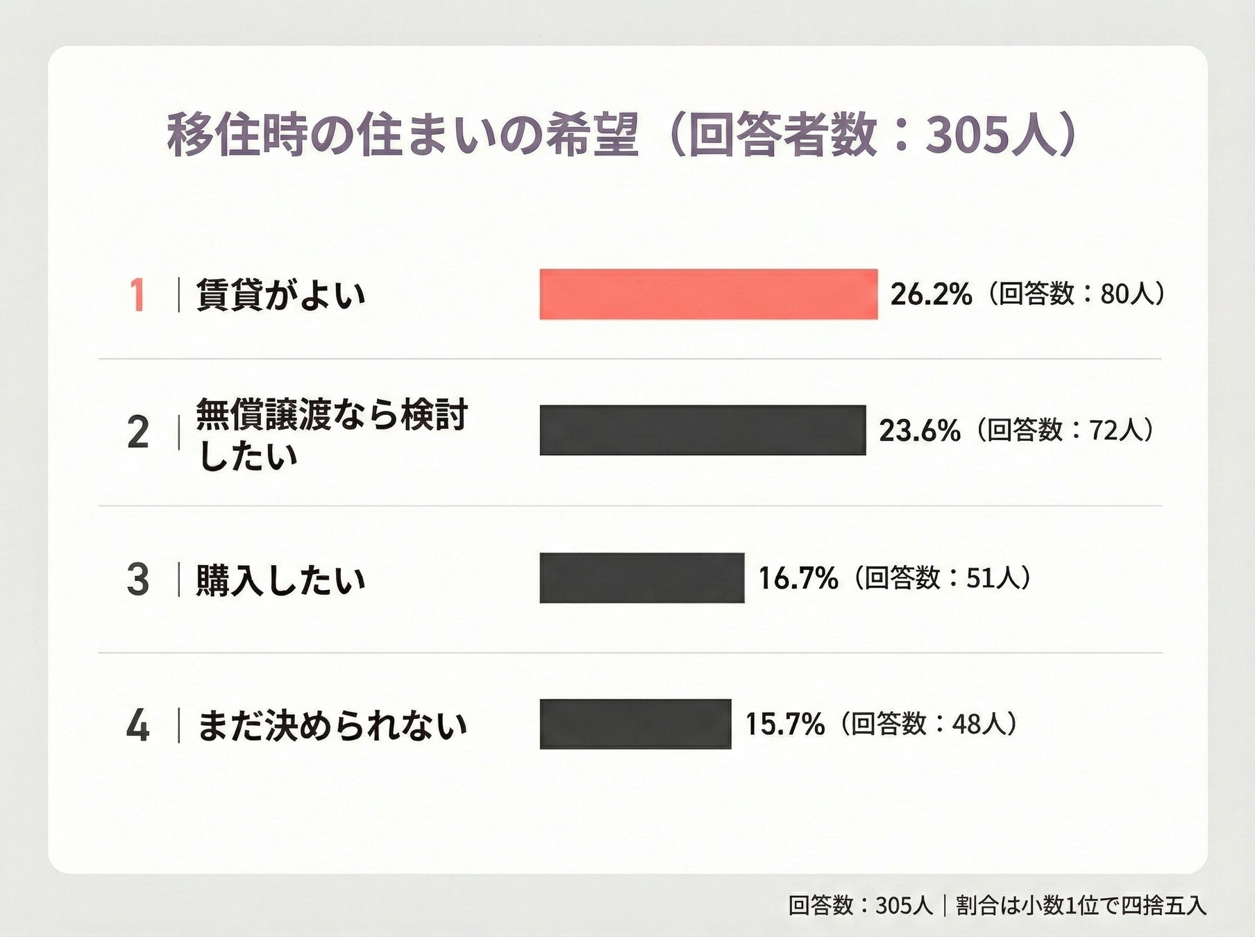 所有よりも、まずは負担を抑えて試したいという志向が見える一方で、購入を選ぶ人も一定数おり、移住の温度感やライフプランによって選好が分かれていることがうかがえます。