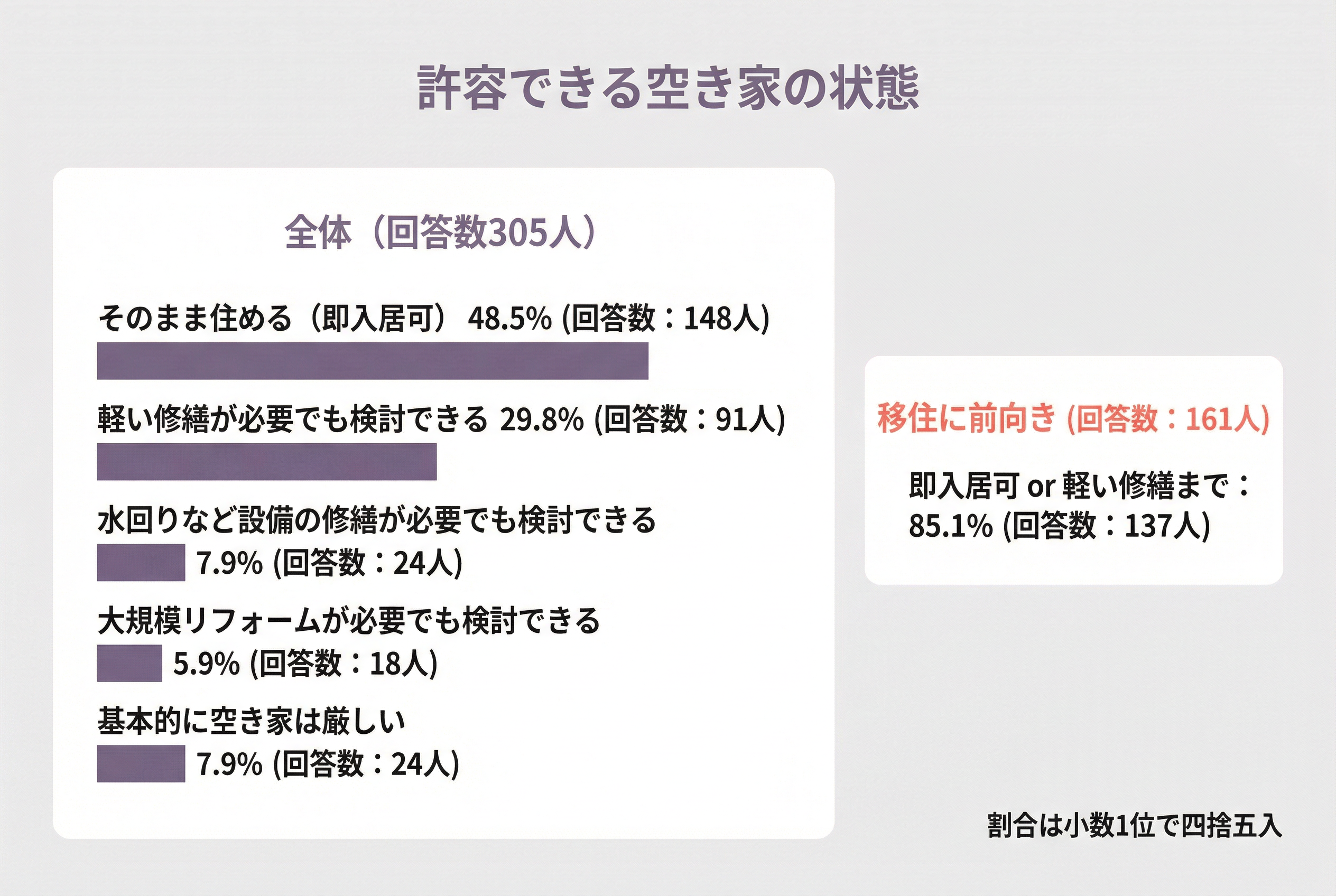 さらに移住したい(ぜひ+条件が合えば)161人に限ると、即入居可または軽い修繕までで85.1%(137人)となり、移住に前向きな層ほど許容範囲が現実的に定まっていることがうかがえます。