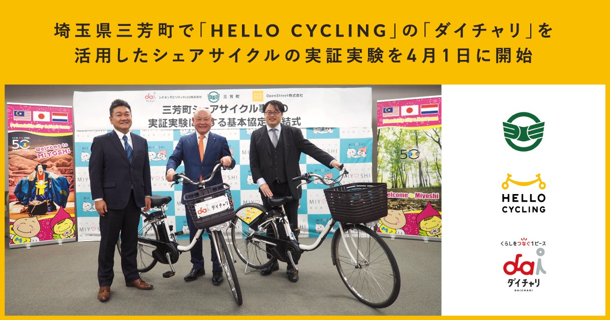 OpenStreet株式会社(本社:東京都港区、代表取締役社長CEO:工藤 智彰、以下「OpenStreet」)と「ダイチャリ」を運営するシナネンモビリティPLUS株式会社(本社:東京都港区、代表取締役社長:菅原 健、以下 シナネンモビリティPLUS)と、埼玉県三芳町(町長:林 伊佐雄)は、「三芳町シェアサイクル事業の実証実験に関する基本協定」を締結し、国内最大級のシェアサイクルプラットフォーム「HELLO CYCLING」を活⽤した「ダイチャリ」を通じて、シェアサイクルの実証実験を2024年4月1日から三芳町で開始することをお知らせします。本協定に基づき、公共交通の機能の補完・代替、地域の活性化に資する新たな町の交通システムとしてのシェアサイクルの有効性及び課題を検証していきます。