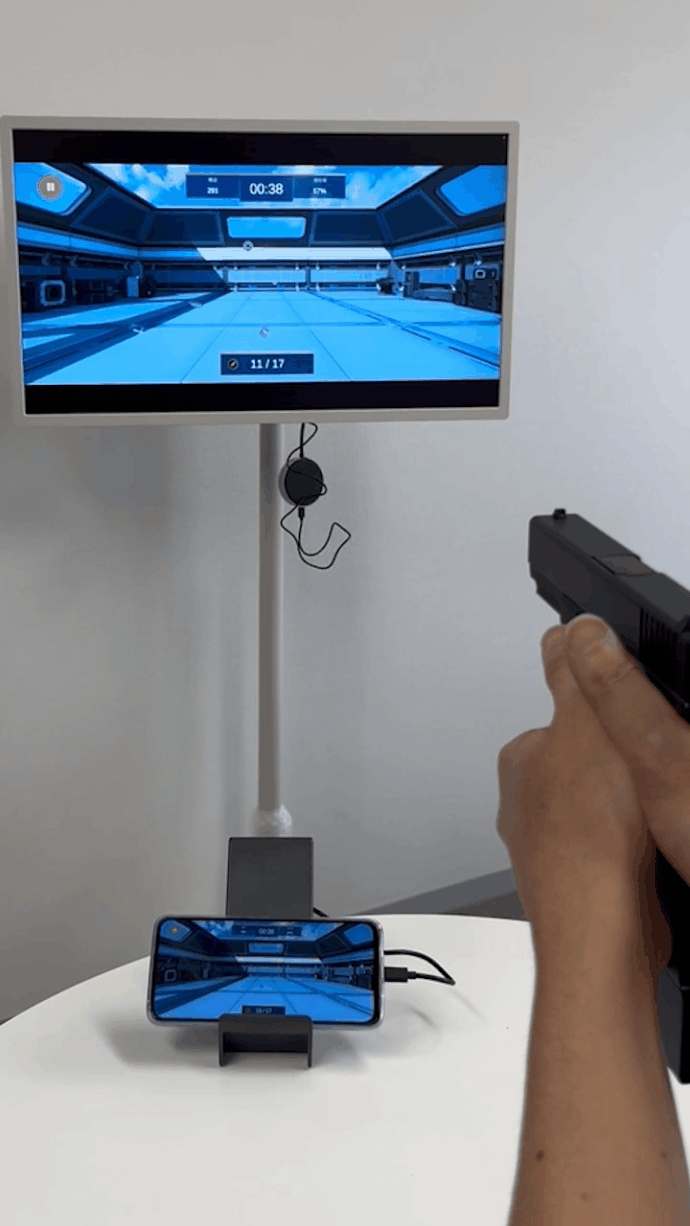 スマートフォンを銃に乗せて銃の向きとスマートフォン画面をリンクさせてシューティングが楽しめます。手軽で、どこででも遊ぶことができます。