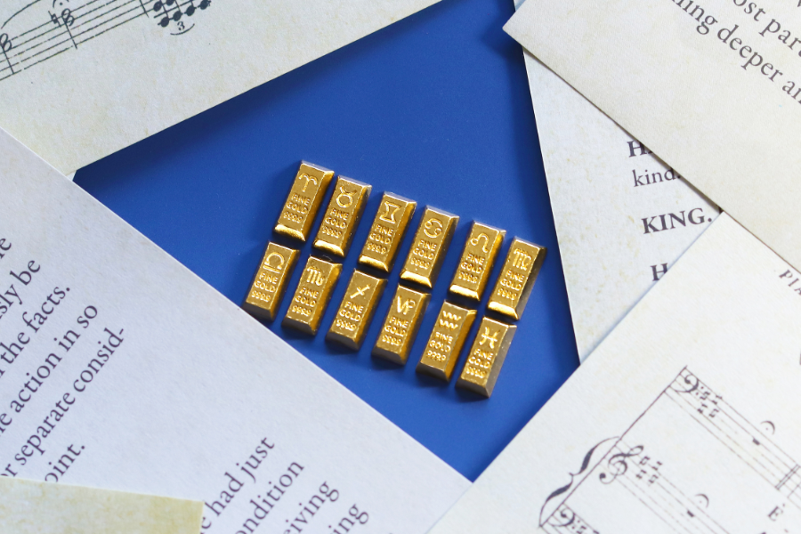 純度99.9%の金「純金」で作った12種類の星座モチーフは各マークがしっかりと刻印されていて、とってもチャーミング。