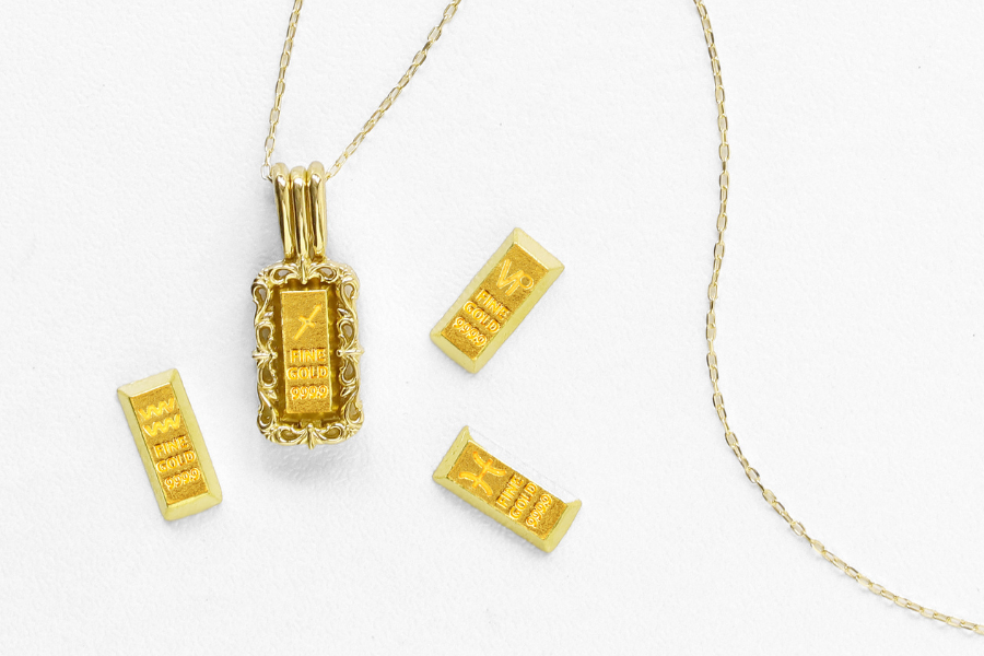 かわいいミニチュアインゴット型のBABYGOLD。専用ペンダントトップに入れれば純金ジュエリーに!黄金の光沢や山吹色の美しい色合いが楽しめます。