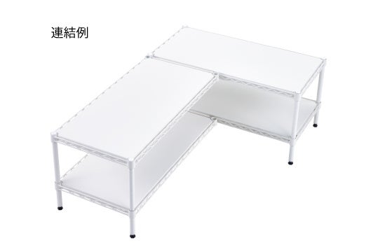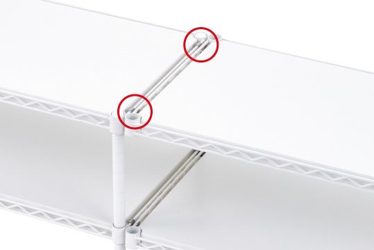 2列連結時は、専用アドオンシェルフコネクターでフラットシェルフ同士、またはフラットシェルフとワイヤーシェルフを安全に水平連結。拡張や配置替えが直感的です。