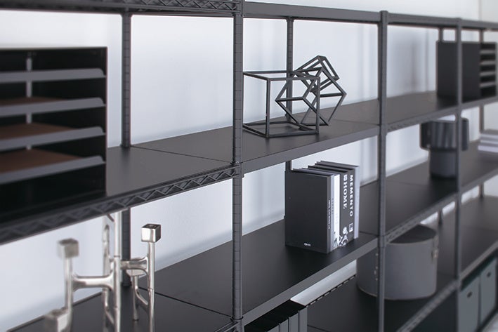 「フラットシェルフ」は、無駄をそぎ落とし、機能美を追求した新しいエレクターシェルフです。スチール天板をかぶせるだけで、左右・前後に自由に連結できる構造を採用しており、組み立てはシンプルで直感的に行うことができます。