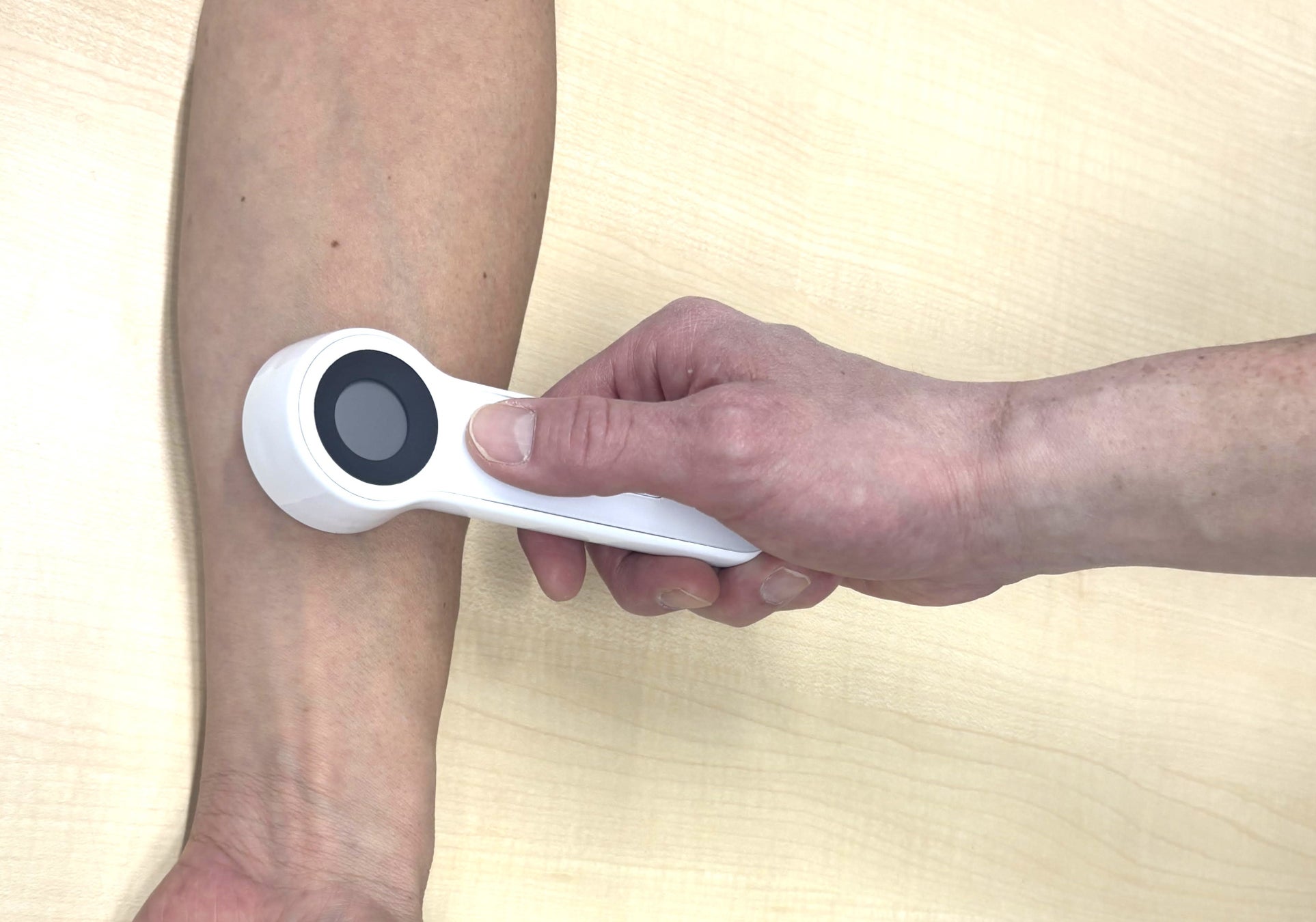 HVSIの取得は、たった2つのステップでOK。電源/測定ボタンをON、吻合部に当ててボタンをプッシュすると、数秒で測定完了します。