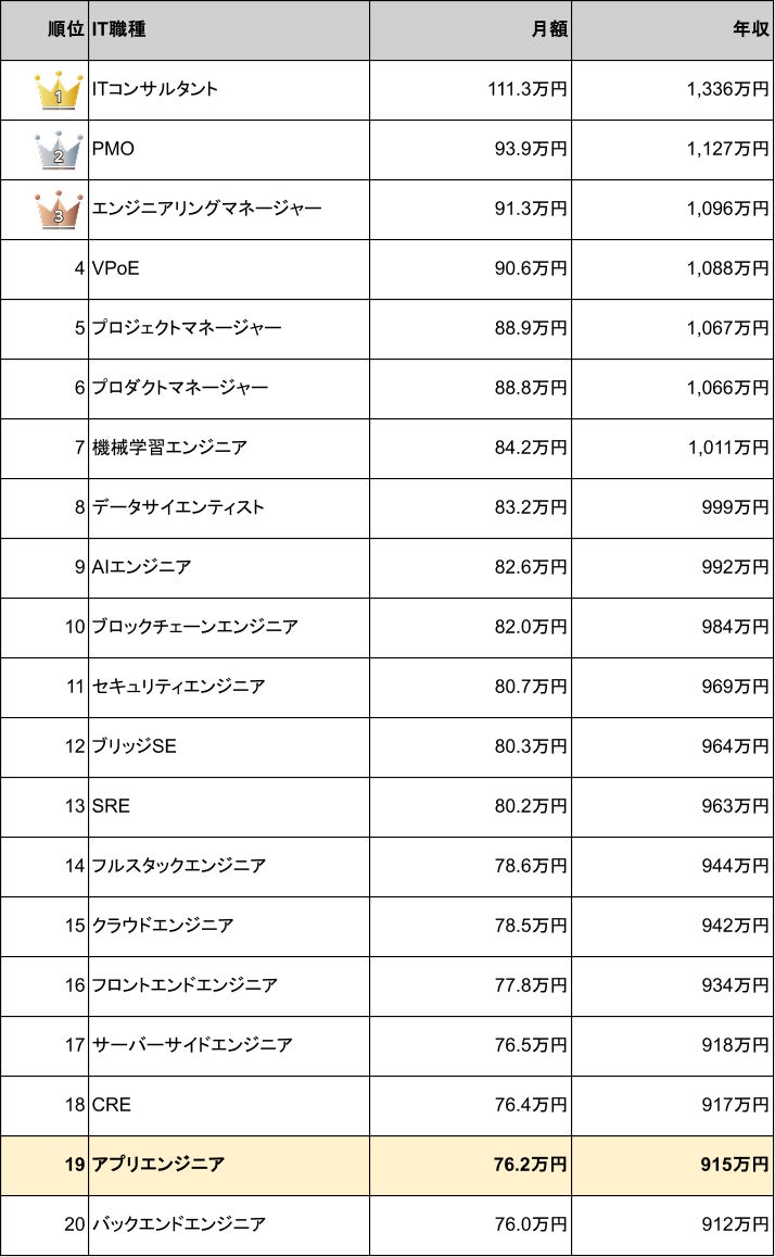 アプリエンジニア案件の平均月額単価は76.2万円、平均年収は915万円で、IT職種別の年収ランキングでは19位に位置しています。