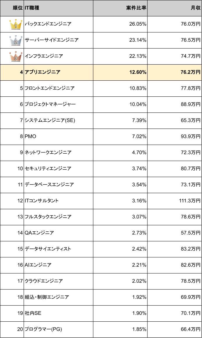 2025年12月時点でアプリエンジニアの案件は市場全体の12.60%を占め、IT職種別の案件数ランキングで4位となっています。