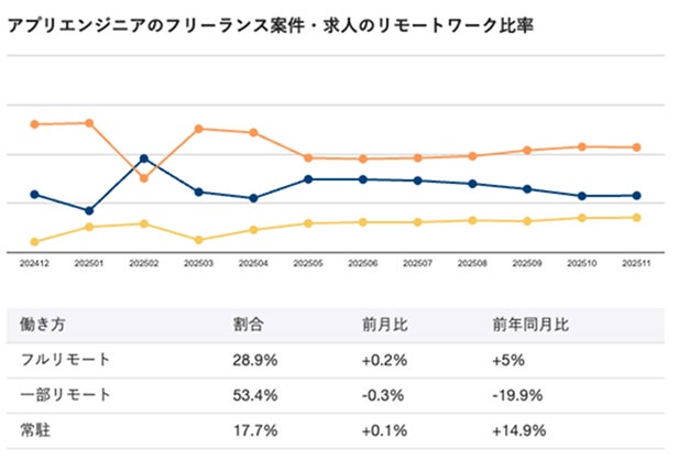 2025年12月時点のアプリエンジニア向けフリーランス案件・求人におけるリモートワーク比率は、フルリモートが28.9%、一部リモートが53.4%、常駐が17.7%となっています。前月比ではフルリモートが+0.2%とわずかに増加し、一部リモートは-0.3%と小幅に減少、常駐は+0.1%とほぼ横ばいで推移しました。