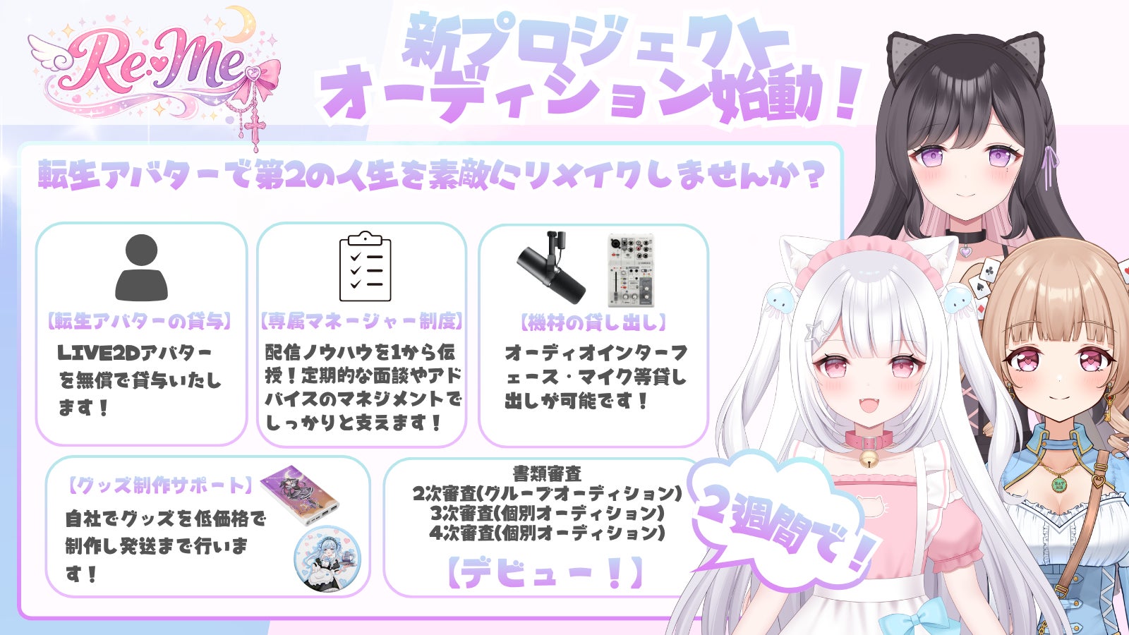 オーディション合格者には業界最大手のノウハウを持つ CORECATISがマネージャーの全面バックアップサポート付きで、ライブ配信や動画を中心に活動をサポート致します。VIRTUAL LIVERに興味がある方や ノウハウがなく何をやったら良いか分からず、活動ができないで悩んでいる方は是非ご応募お待ちしております。