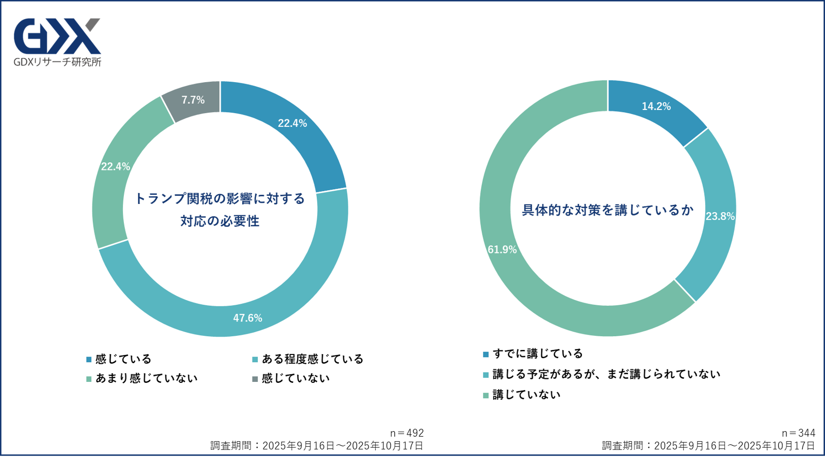 またトランプ関税の影響を受けている内容があると回答した企業のうち、その対応の必要性を感じている企業は約7割に上りましたが、対策の必要性を感じている企業のうち、実際に対策を講じている企業は14.2%にとどまっていることが明らかになりました。
