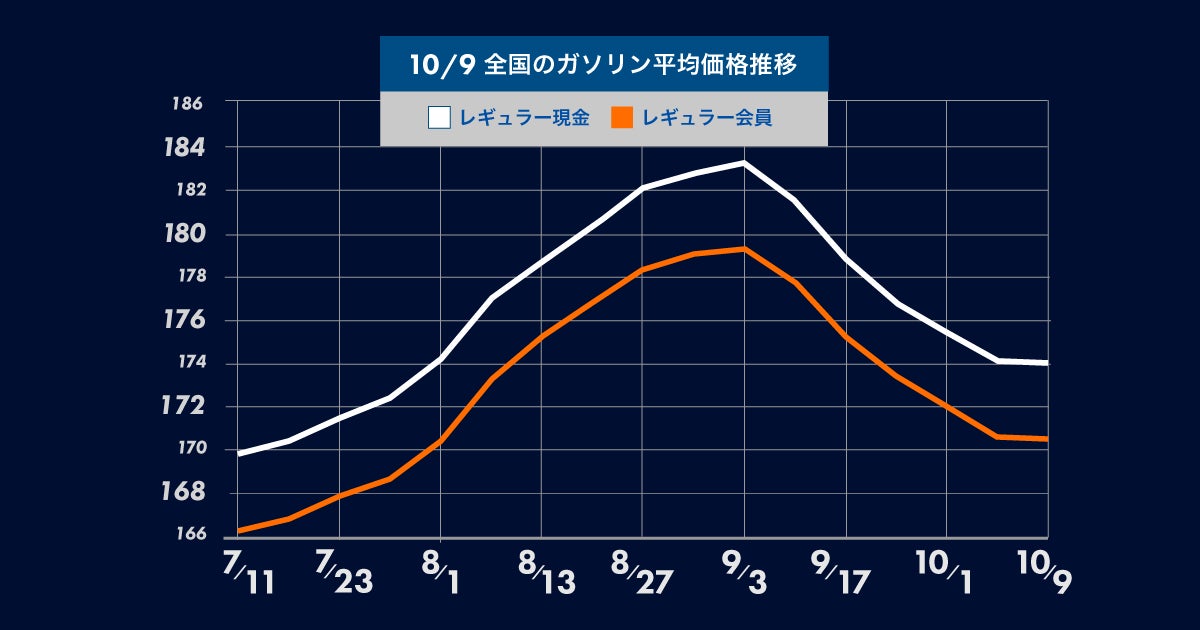 10月9日(月) 時点のレギュラーガソリンの全国平均は、174.0円となり先週から1.7円の値下がり。5週連続の値下がりとなりました。