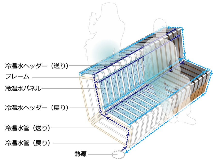 「Comfy TOUCH」は、ベンチなどの家具や床に取り付けた冷温水パネルに、30℃程度に温度調節された水(=冷温水)を流すことにより、熱伝導と輻射熱で冷涼感やぬくもりを得られるシステムです。