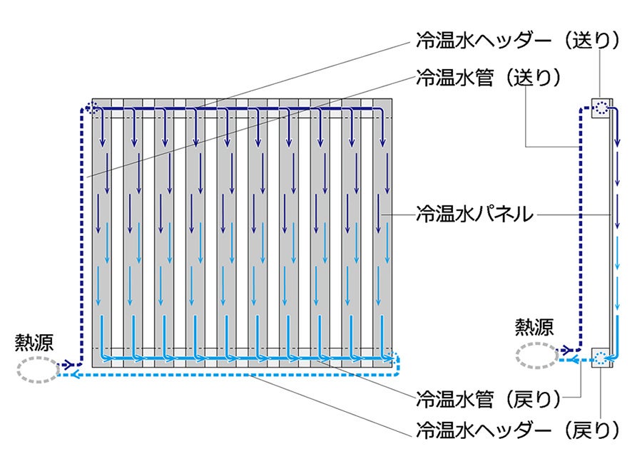 また、パネルに流れる冷温水が30℃前後の中温度帯のため、井戸水や地下水といった自然エネルギーの活用がしやすく、より省エネルギー性能の高い運用も可能です。