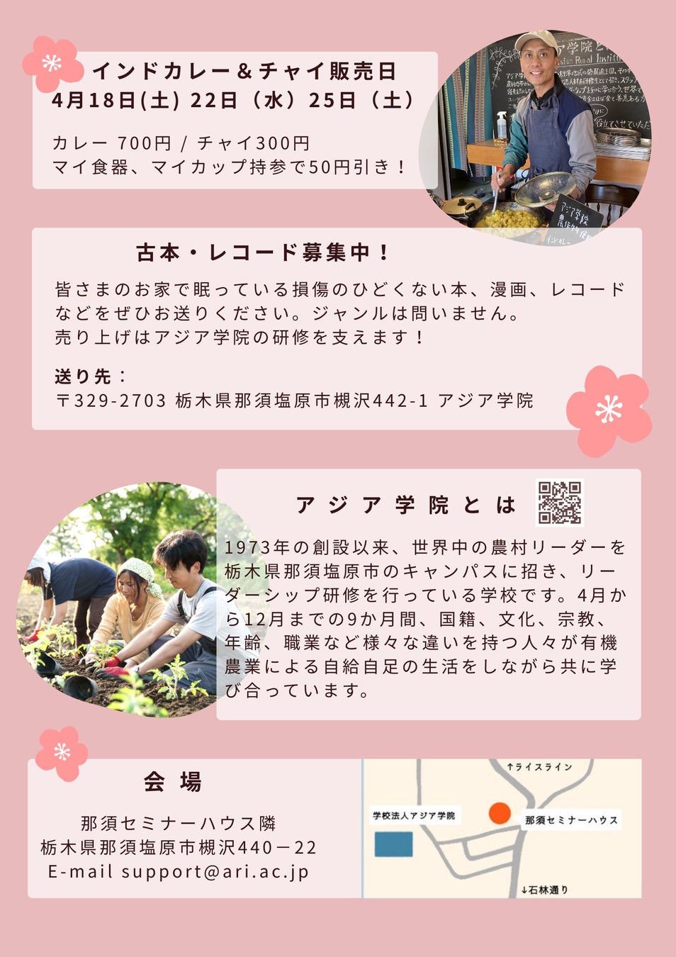 4/17(金)~25(土) 11:00~16:00 4/19(日)はお休み。全国から寄贈された文庫本、絵本、美術書などが100円~。アジア学院の有機食材を使ったカレー&チャイも3日間限定でご用意!