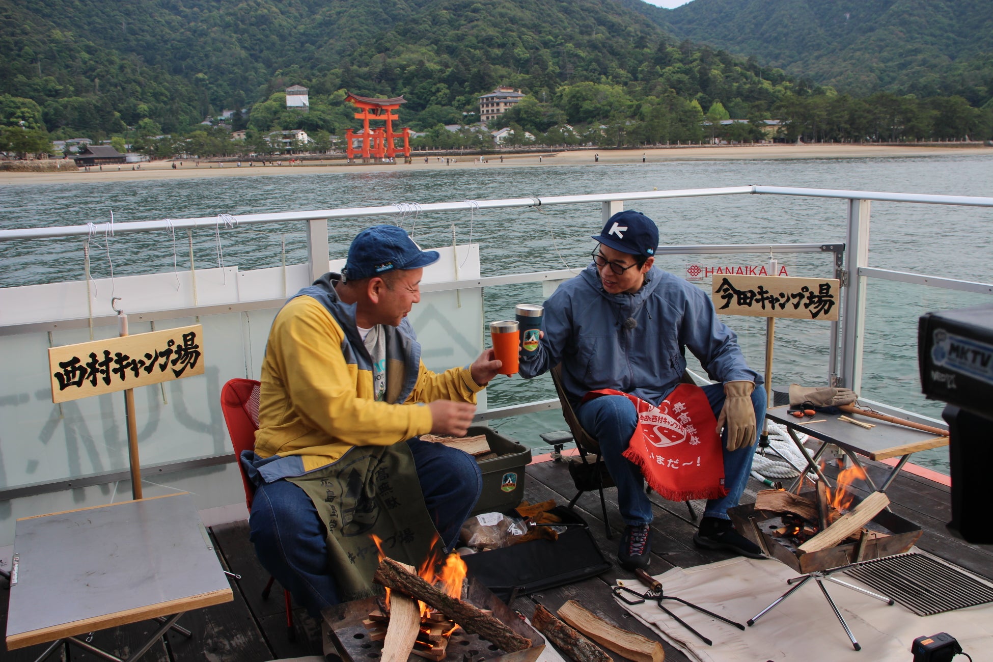 今回のテーマは「広島最高キャンプ飯」ということで、広島ならではの食材を集めるべく、西村が過去にローカル番組でお世話になった生産者さんを二人で訪ねることに。道中、今田にとって初めてとなる広島の路面電車にも揺られながら、500グラムを超える広島牛や、西村が個人的にも大好きだという大野アサリをいただき、さらには自分たちで釣りにも挑戦する。最高の食材を手に、今回のキャンプ場へ向かうため宮島口から乗り込んだのは小型船。出発して数分後、二人の目に飛び込んできたのは世界遺産・嚴島神社をのぞむ「海上いかだ」だった。