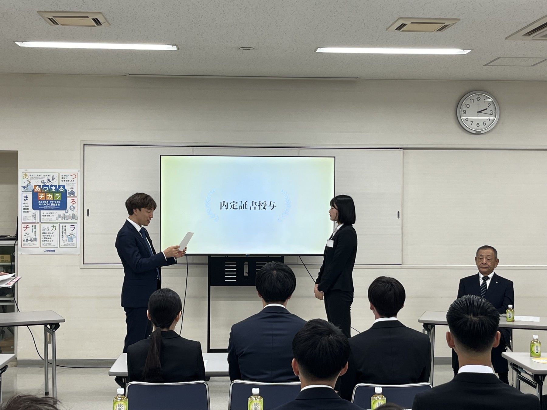 内定式では、代表取締役社長 小野剛より「当社はクニづくり・マチづくり・モノづくりに貢献する事業を行っています。ぜひ皆さんは、どんな企業に就職するのか聞かれた際には先ほどの言葉を、誇りを持って伝えてほしいと思います。」と会社の方針やどのような思いを持って社員が働いているか挨拶をいたしました。その後、内定者一人ひとりに内定証書の授与が行われ、内定者から社会人へ向けた意気込みを語りました。