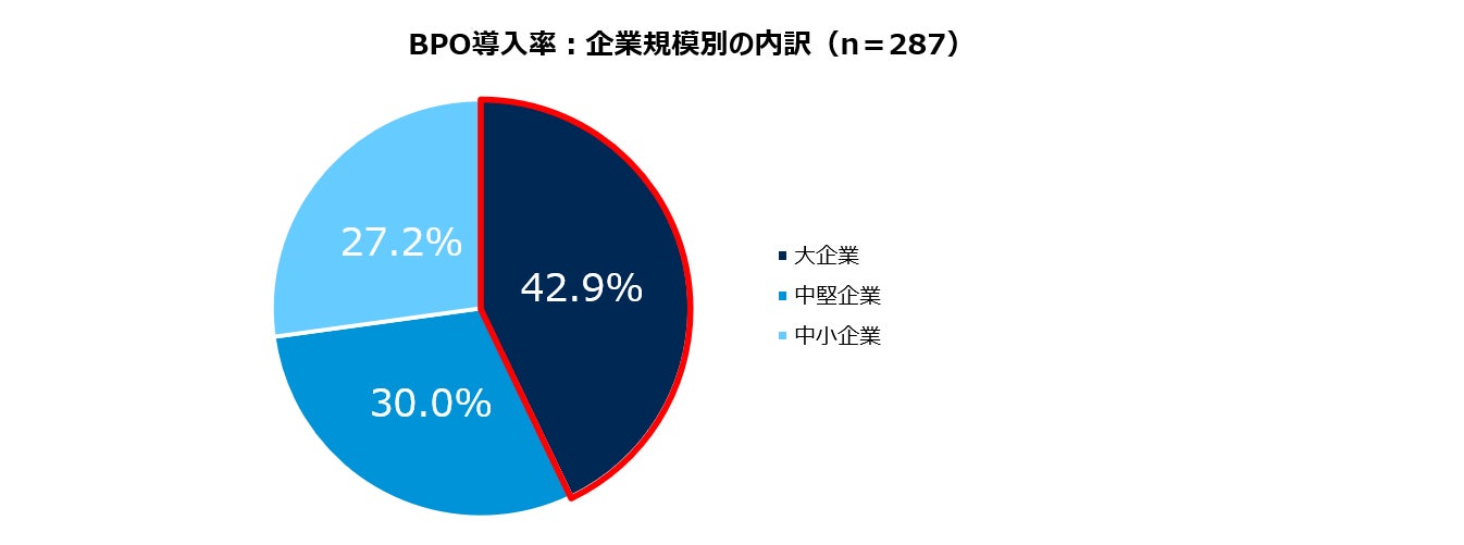 また、現在BPOを導入していると回答した287名の企業規模別の内訳をみると、大企業が4割超えで最も多く、中堅企業と中小企業は3割程度でした。