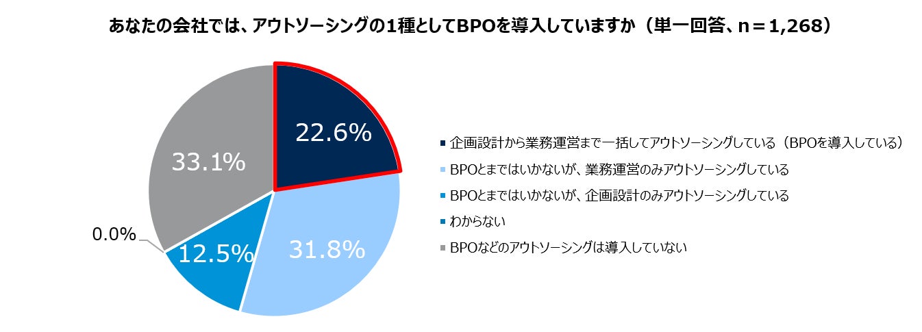 BPO導入の計画・検討・選考に関わる1,268名の経営層または管理職を対象に、BPOの導入状況について聞いたところ、約2割(287名)が「企画設計から業務運営まで一括してアウトソーシングしている(BPOを導入している)」と回答しました。