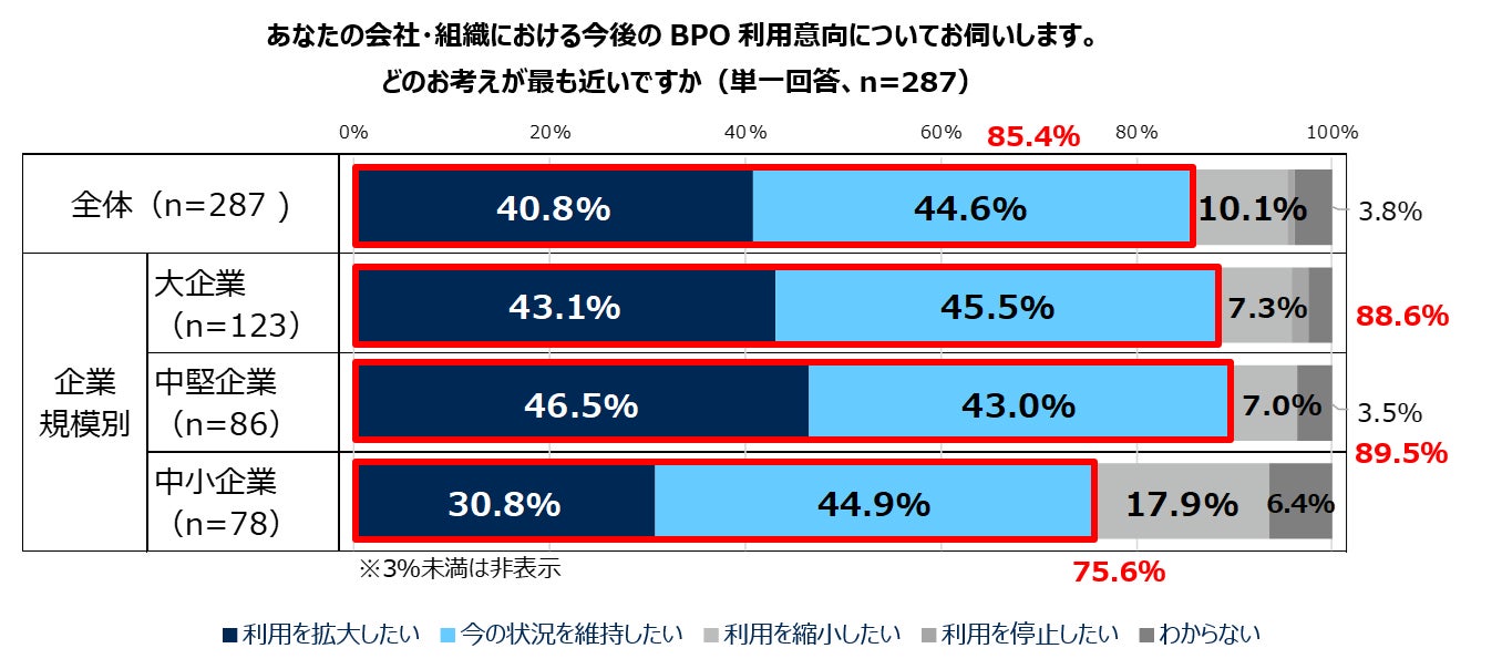 現在BPOを導入していると回答した287名を対象に、今後のBPOの利用意向について聞いたところ、「利用を拡大したい」が40.8%、「今の状況を維持したい」が44.6%で、85.4%が利用拡大・維持の意向を示していることが明らかになりました。また、利用拡大・維持の意向を示している割合を企業規模別にみると、最も多かったのは中堅企業で約9割の89.5%でした。大企業は88.6%と僅差で、中小企業は75.6%でした。