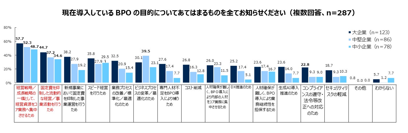 現在BPOを導入していると回答した287名を対象に、導入しているBPOの目的について聞き、回答を企業規模別にみたところ、大企業・中堅企業・中小企業ともに最も多かったのは、「経営戦略/成長戦略の一環として、経営資源をコア業務へ集中させるため」でした。次いで、「固定費を抑制した流動的な経営/事業活動を行うため」でした。また、他の企業規模と比較して多かった回答をみると、中堅企業は「ビジネスプロセスの変革/最適化のため」(39.5%)、大企業は「コンプライアンスの遵守・法令等改正への対応のため」(22.8%)でした。