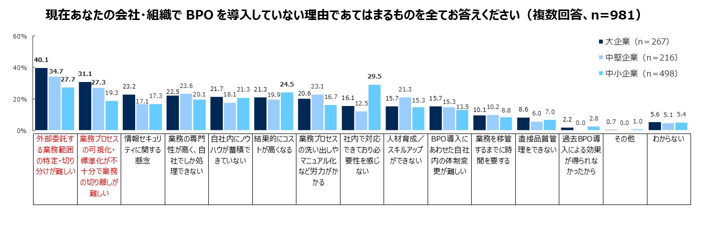 ■BPOを導入していない理由は、「外部委託する業務範囲の特定・切り分けが難しい」が大企業・中堅企業・中小企業ともに上位にあがっており、規模が大きくなるに連れて回答率が高い。中小企業は「社内で対応できており必要性を感じない」(29.5%)、「結果的にコストが高くなる」(24.5%)の回答率が大企業や中堅企業と比べて高い。