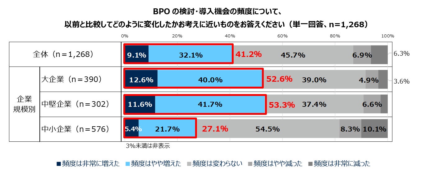 BPO導入の計画・検討・選考に関わる1,268名を対象に、以前と比較してBPOの検討・導入機会の頻度が変化したか聞いたところ、9.1%が「頻度は非常に増えた」、32.1%が「頻度はやや増えた」と回答し、41.2%が検討・導入機会の頻度が増えたことがわかりました。また、BPO検討・導入機会が増えた割合を企業規模別にみると、大企業は52.6%、中堅企業は53.3%と半数を超える結果でした。一方、中小企業は27.1%でした。