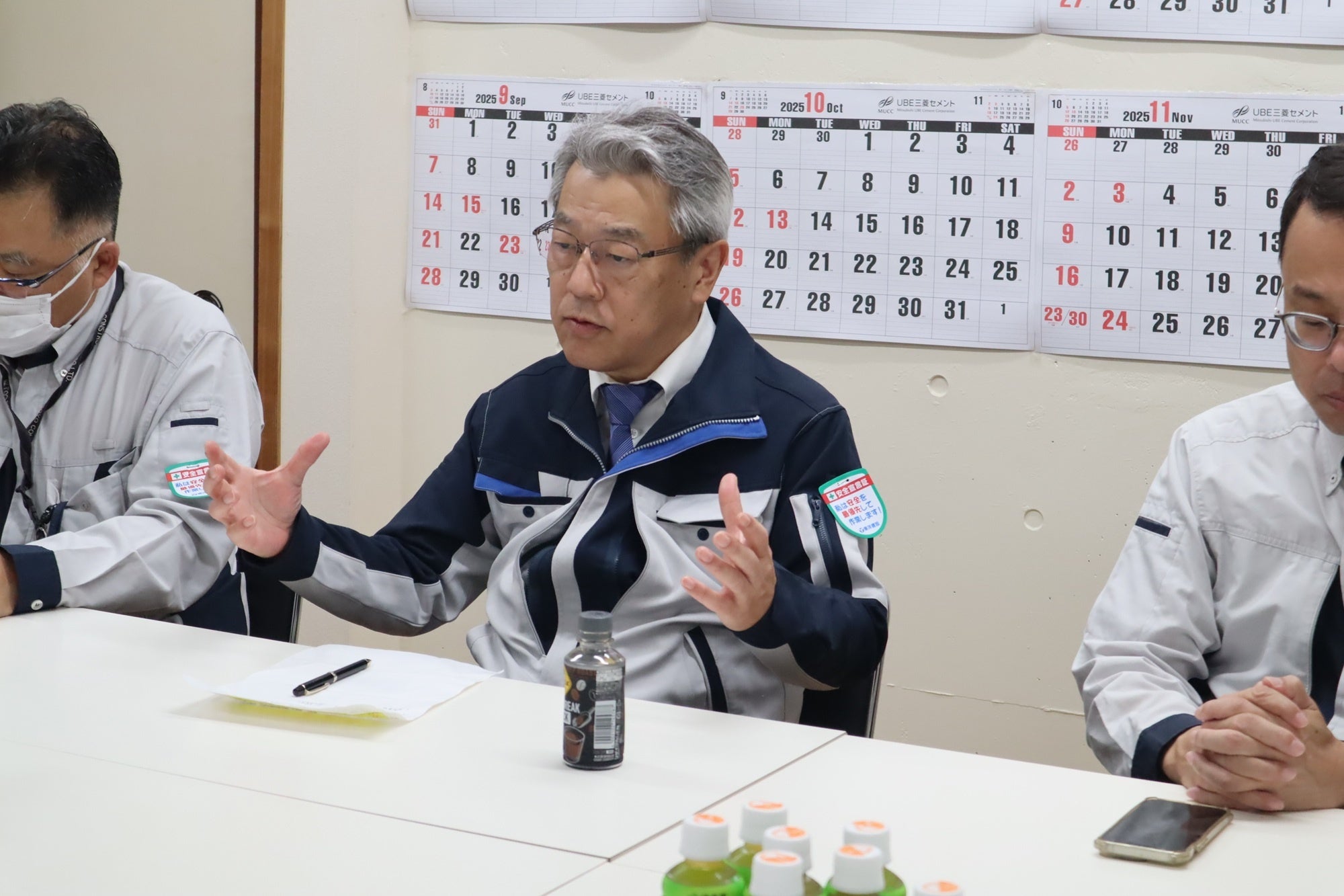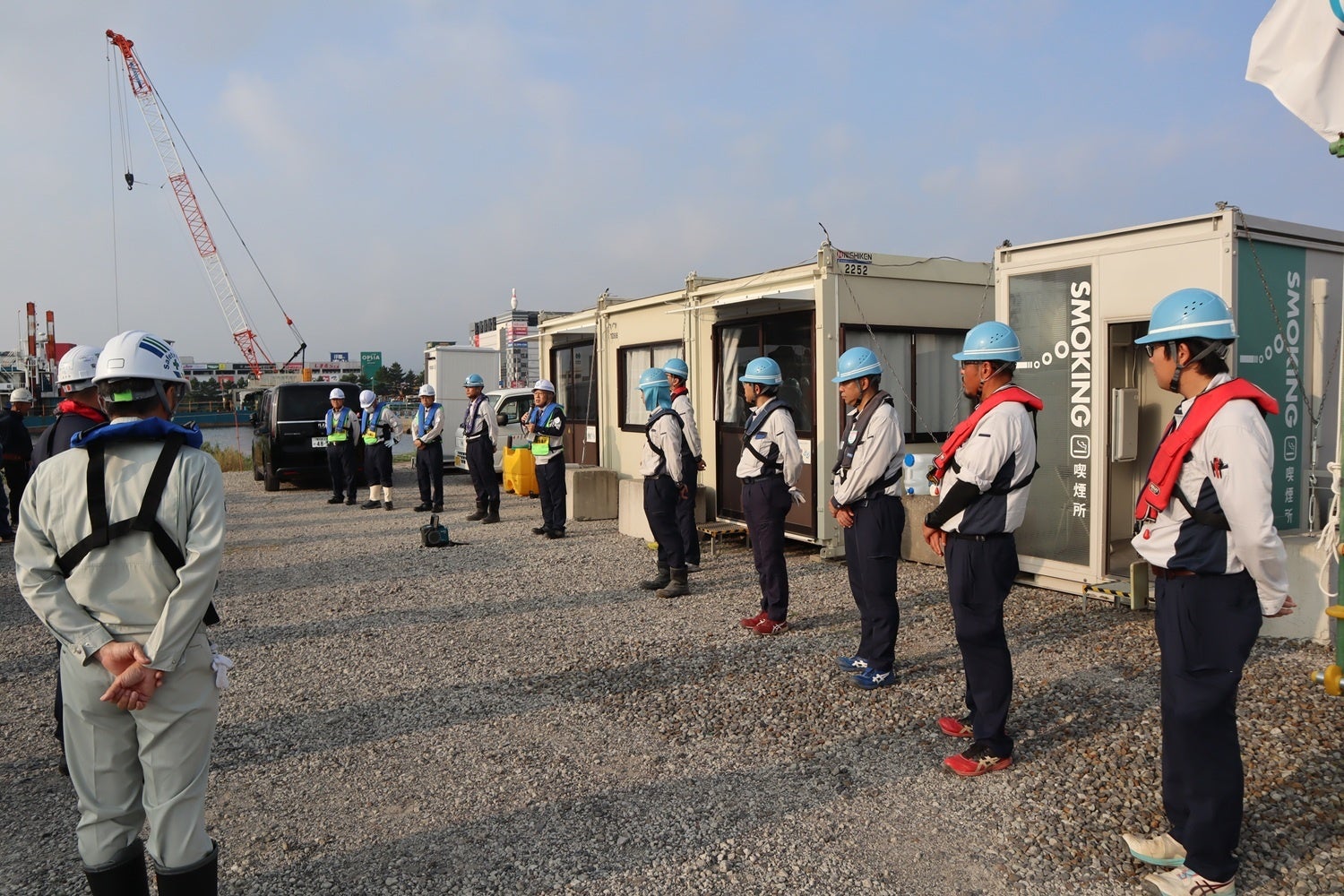 中村社長は朝礼時に、「緊張感をもって、合図の徹底と周囲の安全確認を行いながら作業を行っていただきたい」「10月とはいえ、当地はまだまだ30℃を超える日が続いているので、熱中症に注意しながら安全作業をお願いします」と挨拶しました。