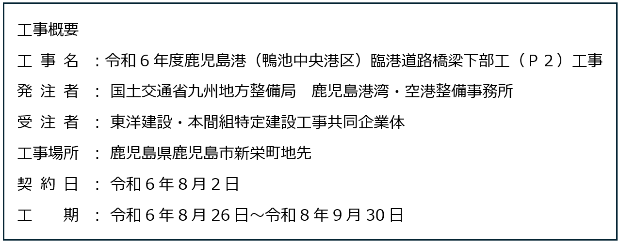 東洋建設株式会社(本社:東京都千代田区、代表取締役 会長執行役員CEO:吉田真也)は、10月9日(木)に鹿児島県鹿児島市で施工している「鹿児島港臨港道路橋梁下部工事(発注者:国土交通省九州地方整備局)の現場パトロールを実施しました。