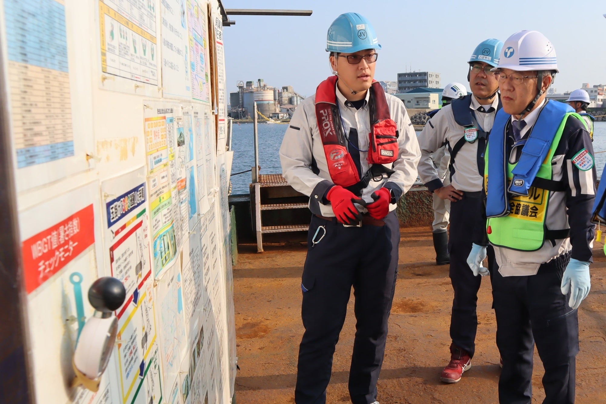 中村社長からは、「安全通路や乗船設備の整備状況は良好ですが、その維持にも努めていただきたい。日々の安全管理には、職員と現場で働く皆さんとのコミュニケーションが重要です。その一例として、安全掲示板等のさらなる“見える化”など、今まで以上に工夫をして欲しい」との指示がありました。
