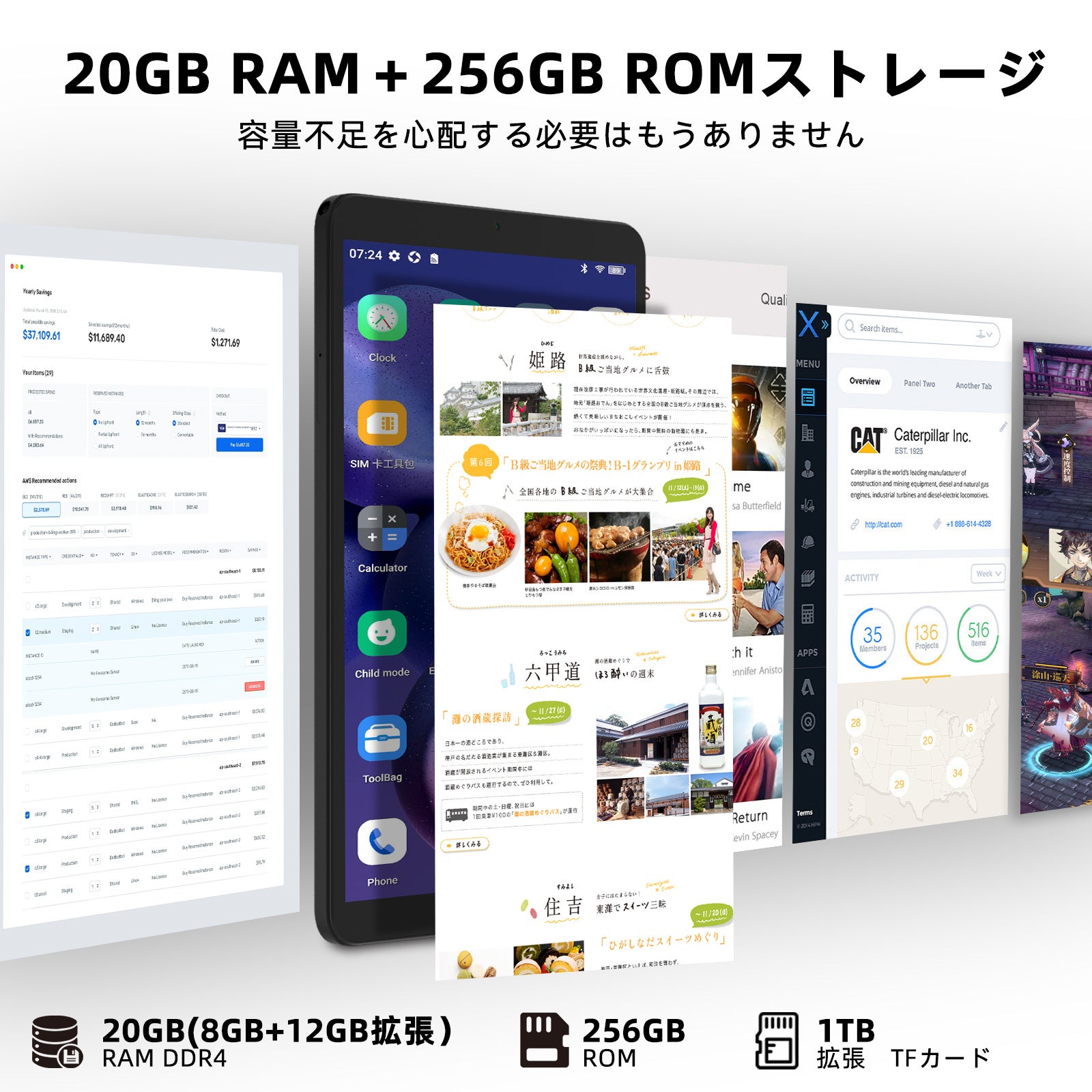 DOOGEE T20 MINI PRO タブレット 8インチは 搭載されているメモリは8GBであり、ストレージから12GBを仮想メモリに割り当てることで、合計20GBの利用が可能です。内部ストレージは256GBであり、最大で1TBまでのSDカードを使用して拡張することができます。これにより、多くのデータやメディアを手軽に保存することができます。高速なストレージにより、データの読み込みやファイルの転送もスムーズに行えます。金属製の筐体は202.5*125.8*7.5mmのサイズで、約316gと片手で操作しやすいコンパクトなサイズです。電子書籍の閲覧やYouTubeの動画視聴、ウェブブラウジングなどを気軽に楽しむことができます。一台で多くの作業やエンターテイメントを楽しめる、パワフルで便利なデバイスです。