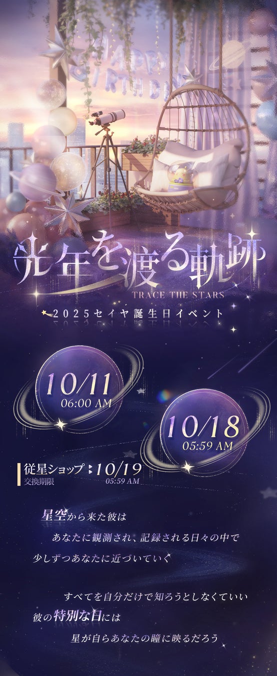 世界中で大人気の恋愛シミュレーションゲーム『恋と深空』が10/11(土)よりセイヤ誕生日イベント「光年を渡る軌跡」を開催!セイヤの新限定星5思念が登場!