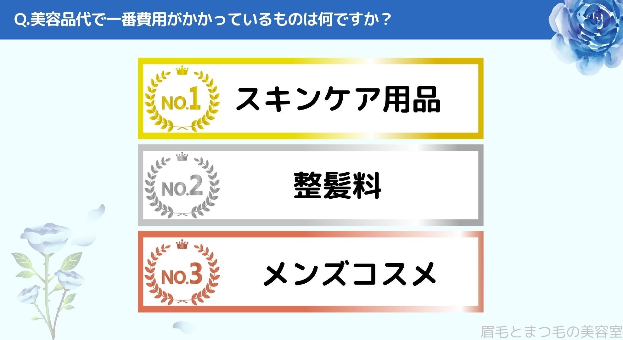 美容品代で一番費用がかかっているものをお聞きしたところ「1位>スキンケア用品」、「2位>整髪料」、「3位>メンズコスメ」という結果になりました。