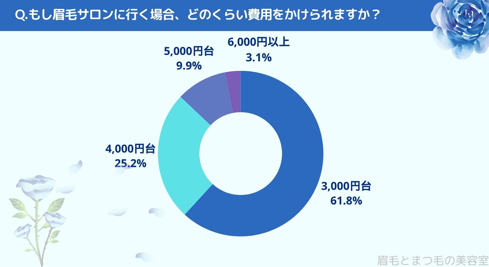 もし眉毛サロンに行くとしたらどのくらい費用をかけられるかお聞きしたところ「3,000円台(61.8%)」、「4,000円台(25.2%)」、「5,000円台(9.9%)」、「6,000円台(3.1%)」という結果になりました。