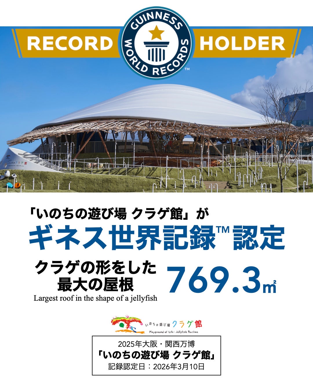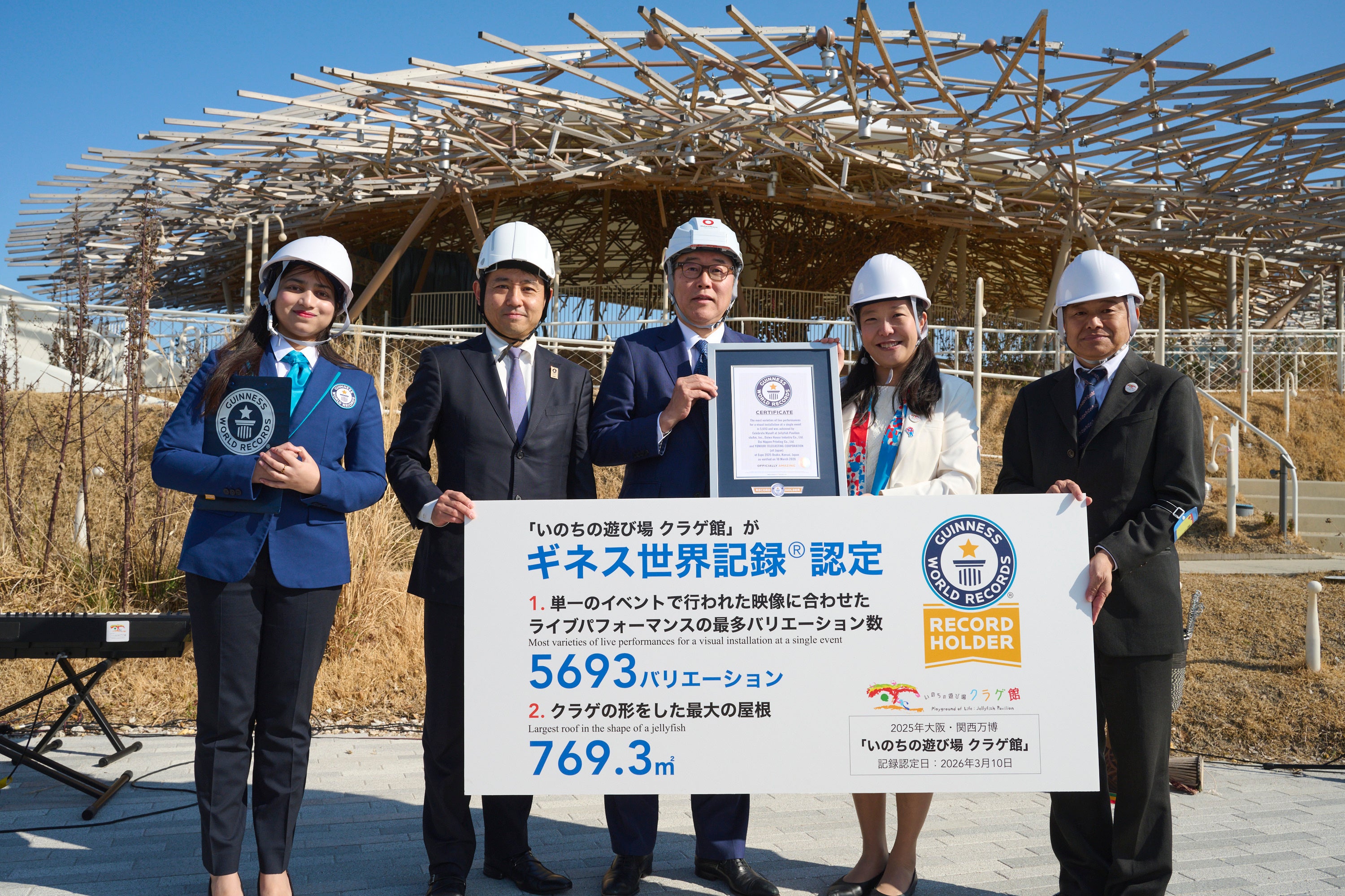 株式会社steAm代表の中島さち子がテーマ事業プロデューサーを務めた2025年大阪・関西万博シグネチャーパビリオン「いのちの遊び場 クラゲ館(以下、クラゲ館)」は、「単一のイベントで行われた映像に合わせたライブパフォーマンスの最多バリエーション数」および「クラゲの形をした最大の屋根」の2つのギネス世界記録™を達成しました。記録認定日は2026年3月10日。3月16日には解体直前の「クラゲ館」前で公式認定証授与式が行われました。