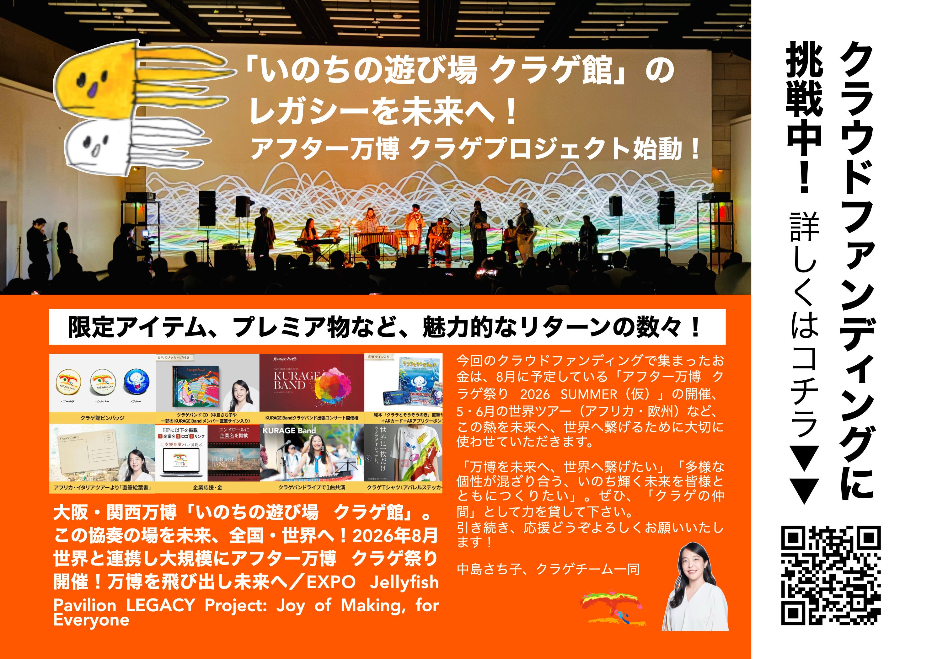 すでに2026年2月28日には「アフター万博 クラゲ祭り」を開催し、1200名を超える方々にご参加いただきました。現在も万博の取り組みを未来へつなぐ「アフター万博 クラゲプロジェクト」を進めており、2026年夏には新たに大規模な「クラゲ祭り」の開催も予定しています。その実現に向け、現在、クラウドファンディングにも挑戦しています。