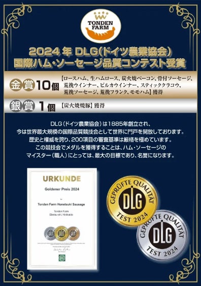 トンデンファームの商品は、ドイツの農業振興協会が主催する国際ハム・ソーセージ品質コンテストで、2024年度に11商品が金賞・銀賞を受賞しています。