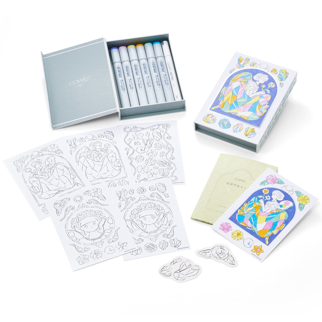 セットのイラストや塗り絵を担当したのは、コピックブランドムービーのキービジュアルイラストを描いていただいたこともある人気イラストレーターの北澤平祐さん。