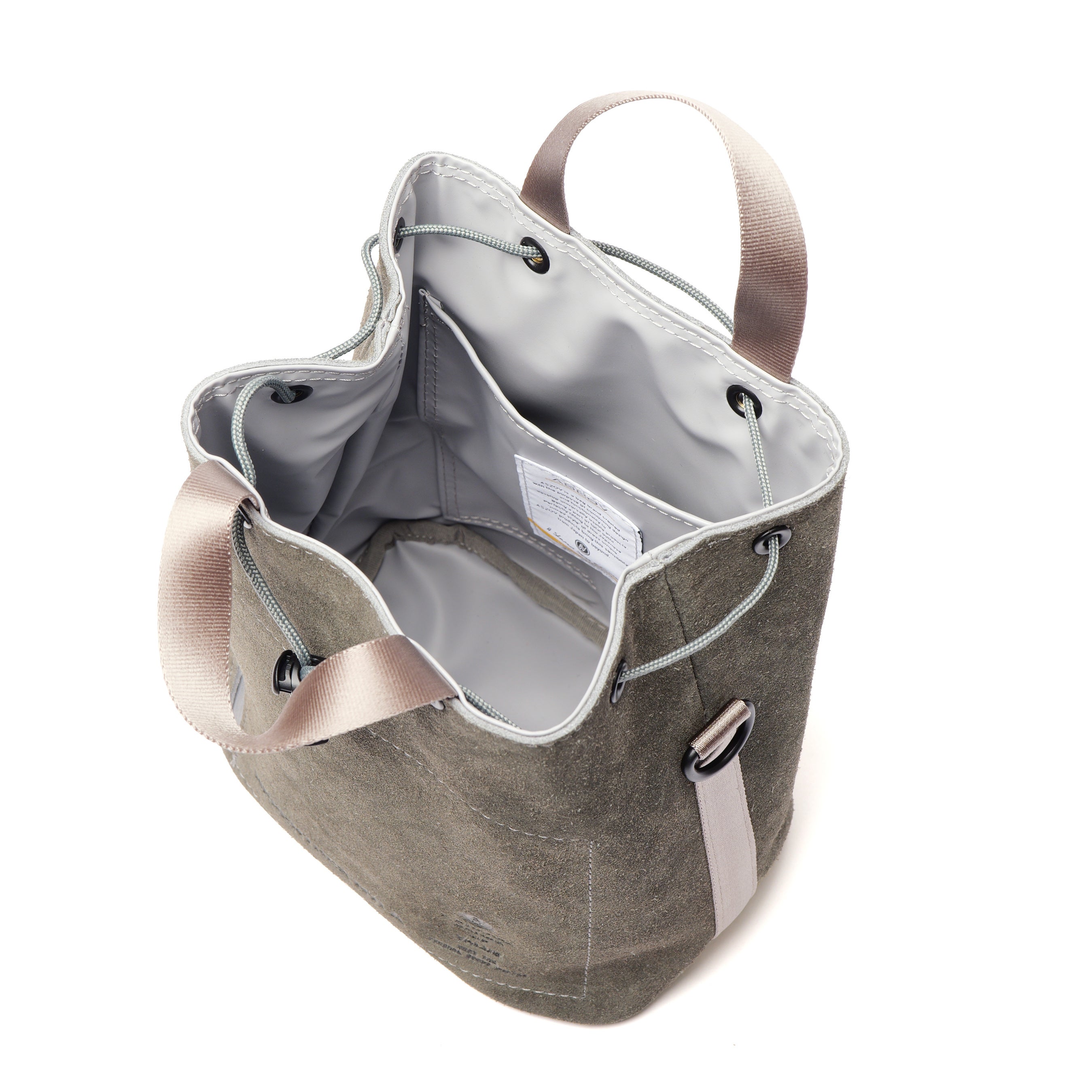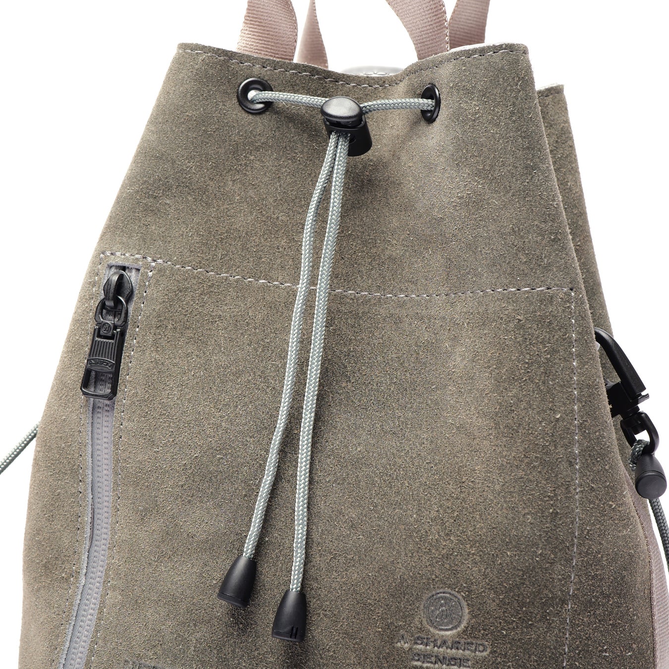 ショルダー肩部分はスエードパーツになっているため、荷物の重さも軽減してくれます。 ワンアクションで長さの調整ができるパーツのついたドローコードは今回の生地に合わせたカラーに。気分や着用シーンに合わせて様々なかたちでバッグをお楽しみいただけます。