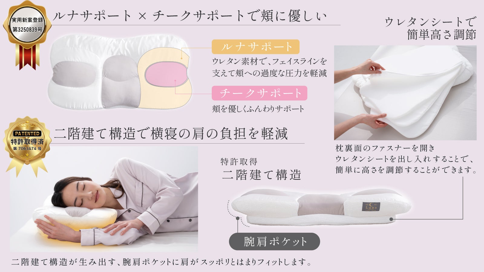 特許取得済みの”⼆階建構造”で横寝時の肩の負担を軽減