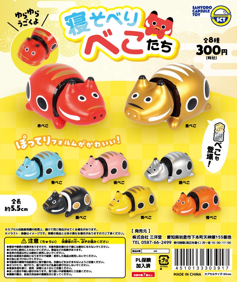 縁日商材をはじめとする玩具等の製造販売を行う株式会社三洋堂(本社:愛知県岩倉市、代表取締役:折小野 嘉輝)は、カプセルトイの新商品「寝そべりべこたち」全8種を、2026年4月下旬より全国のカプセルトイ自動販売機で1回300円(税込)にて順次発売を開始いたします。